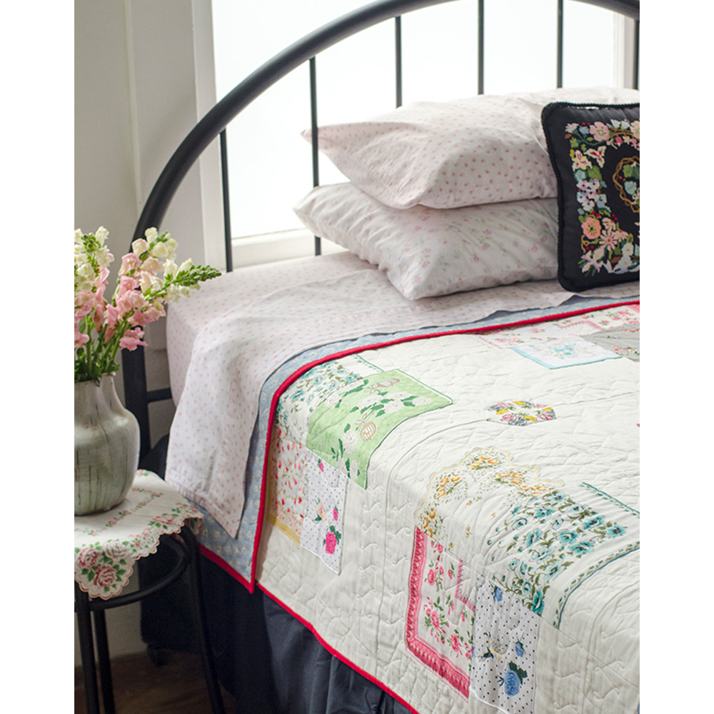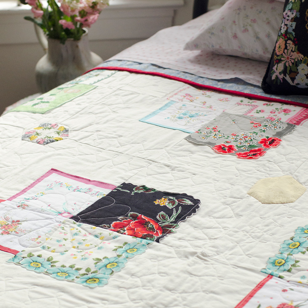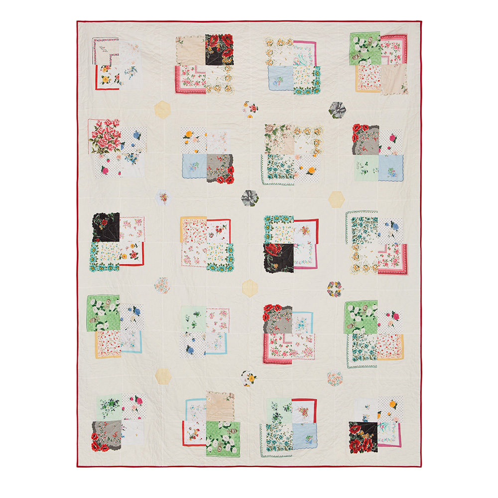 A collection of women’s hankies inspired this quilt. Blair had a few and they all had “Jean D’Orly” as the stamped signature. Online research didn’t reveal a ton of information about these hankies, but there were a generous supply of them listed on Ebay, and that’s how the collection became large enough to pick and choose what would be used in this quilt. A more modern interpretation of the handkerchief quilts Blair had seen in the past. It wasn’t as scary to cut into them as she thought it would be!