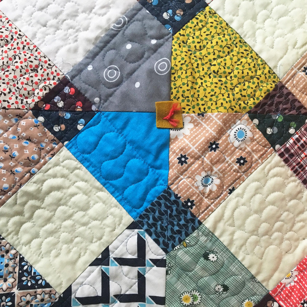 The blocks of this design only appear to be on point, they are deceptively simple. Blair used several different shades of Kona off white solid shades for the centers of the blocks.This is another design she has made several times over.