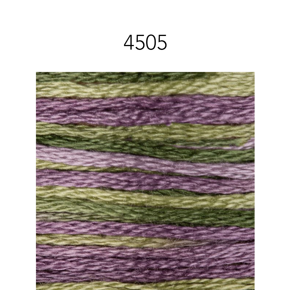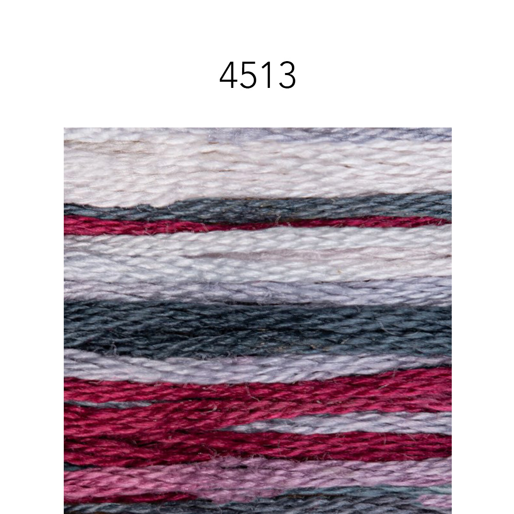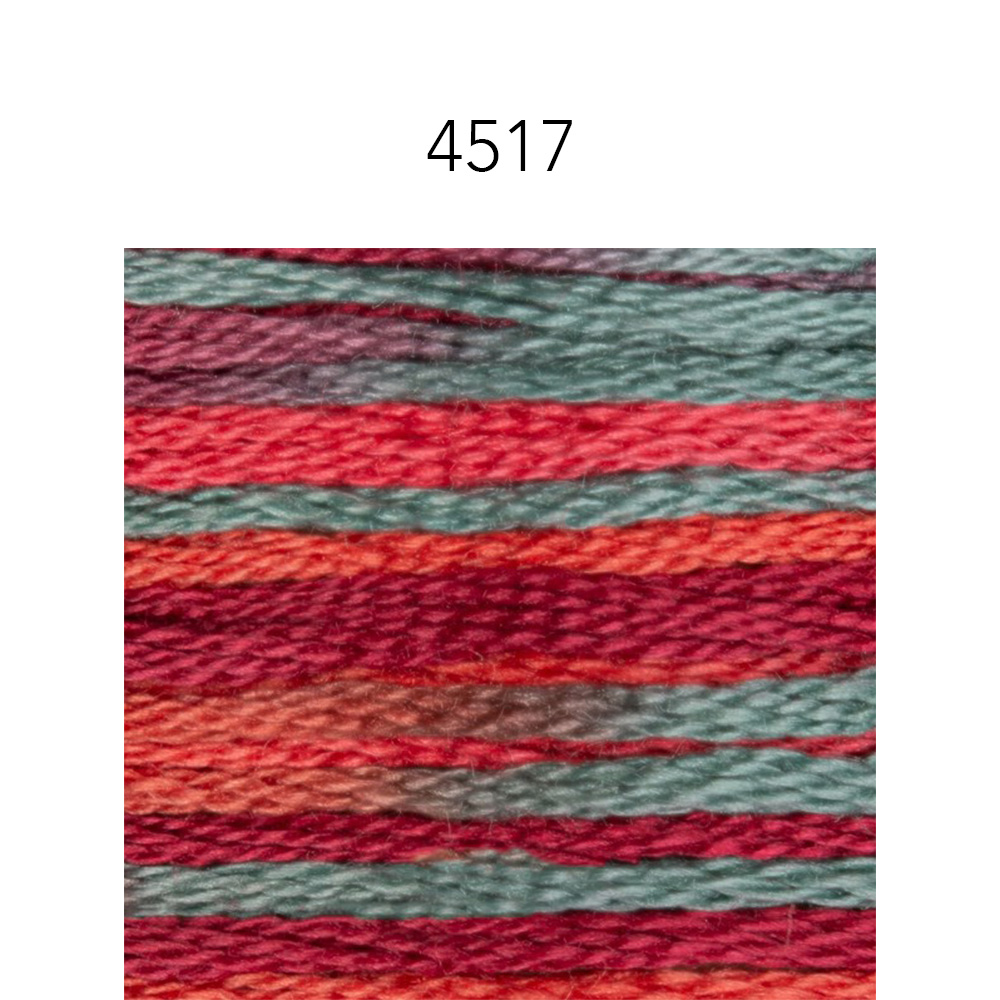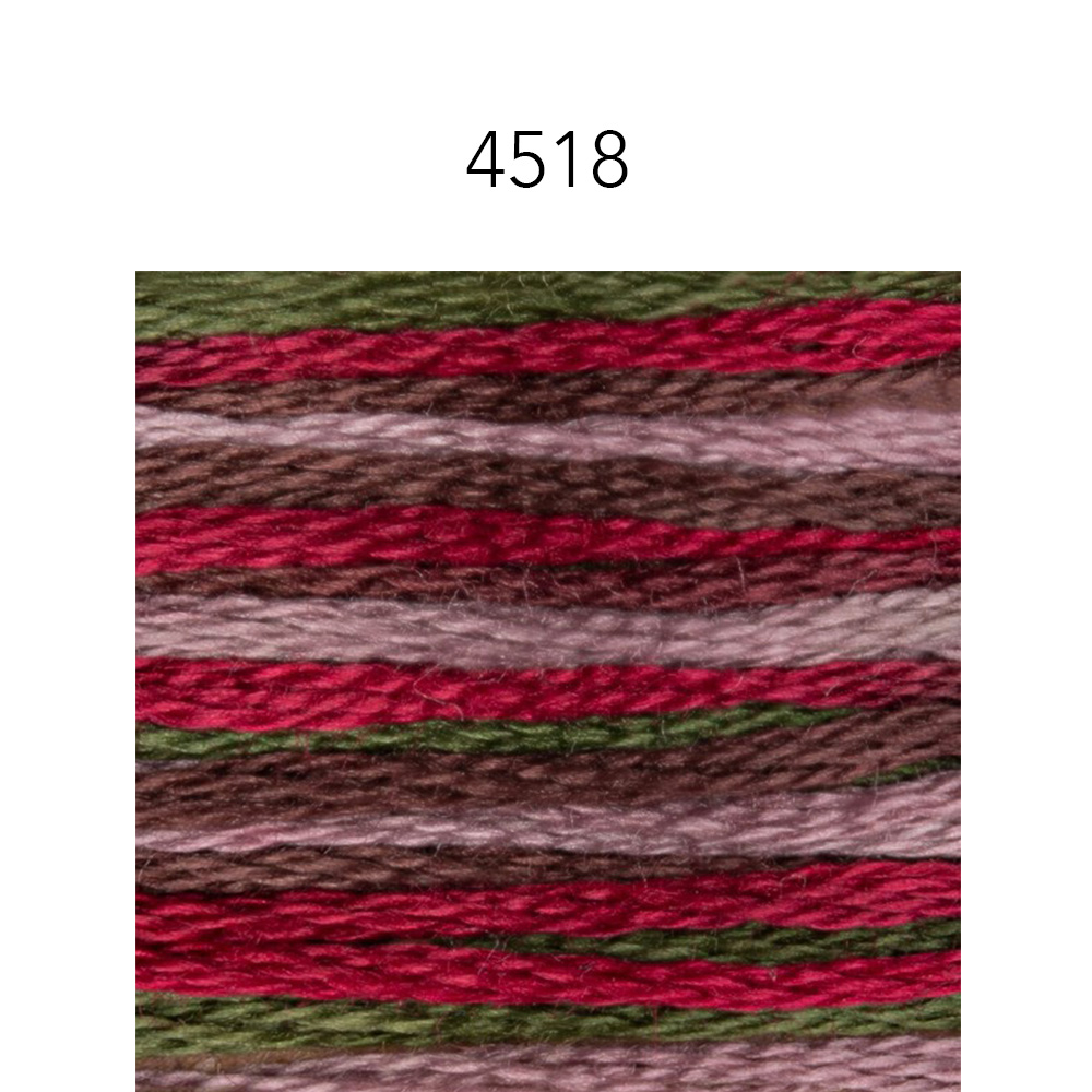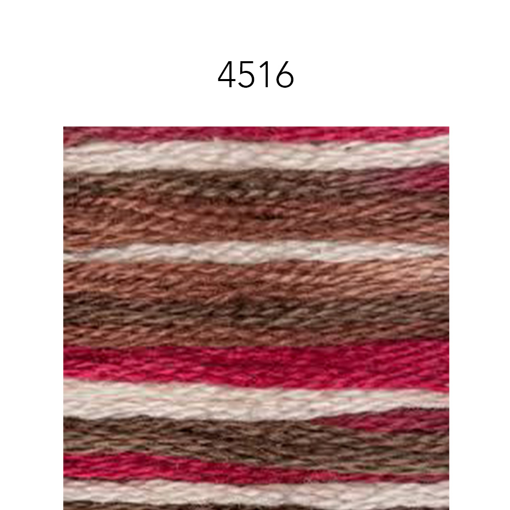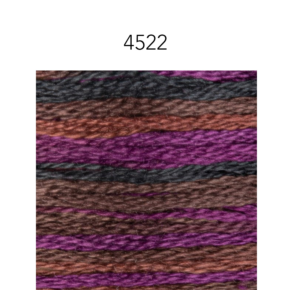 I love watching the colors change when stitching with variegated thread. This is the same 6 strand, DMC floss and thread quality you know, but each skein of this beautiful thread has 4 DMC floss colors that it changes between as you stitch. A coordinated palette of warm and cool complementary colors.