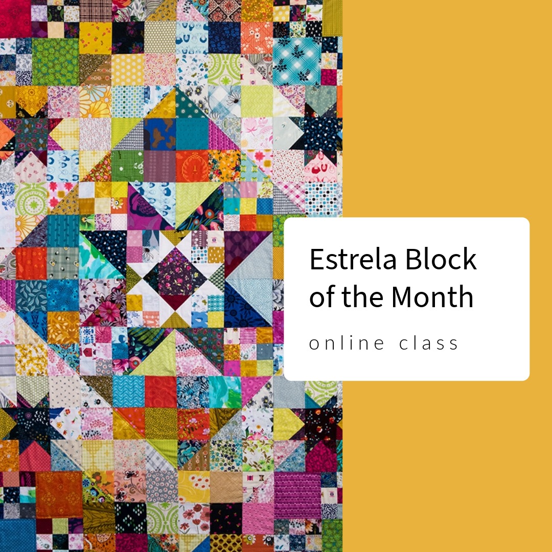 Estrela is the Portuguese word for “star”, and this quilt has lots of beautiful scrappy stars! This is the full 12 month program (plus a finishing month) that will give you new ways to look at your fabric stash. We’ve all got plenty of fabric, let’s use it!