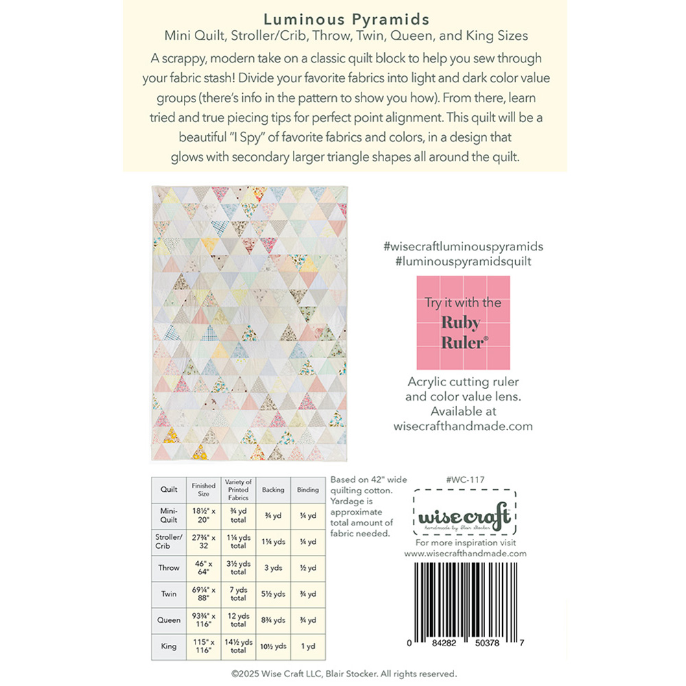 The Luminous Pyramids quilt pattern is a scrappy, modern take on the classic thousand pyramids quilt, designed to help you play with light and dark color value in your favorite low‑volume fabrics. This quilt pattern helps you turn your favorite subtle prints and neutrals into a luminous design that appears to glow, using simple triangle shapes that create secondary patterns across the layout.